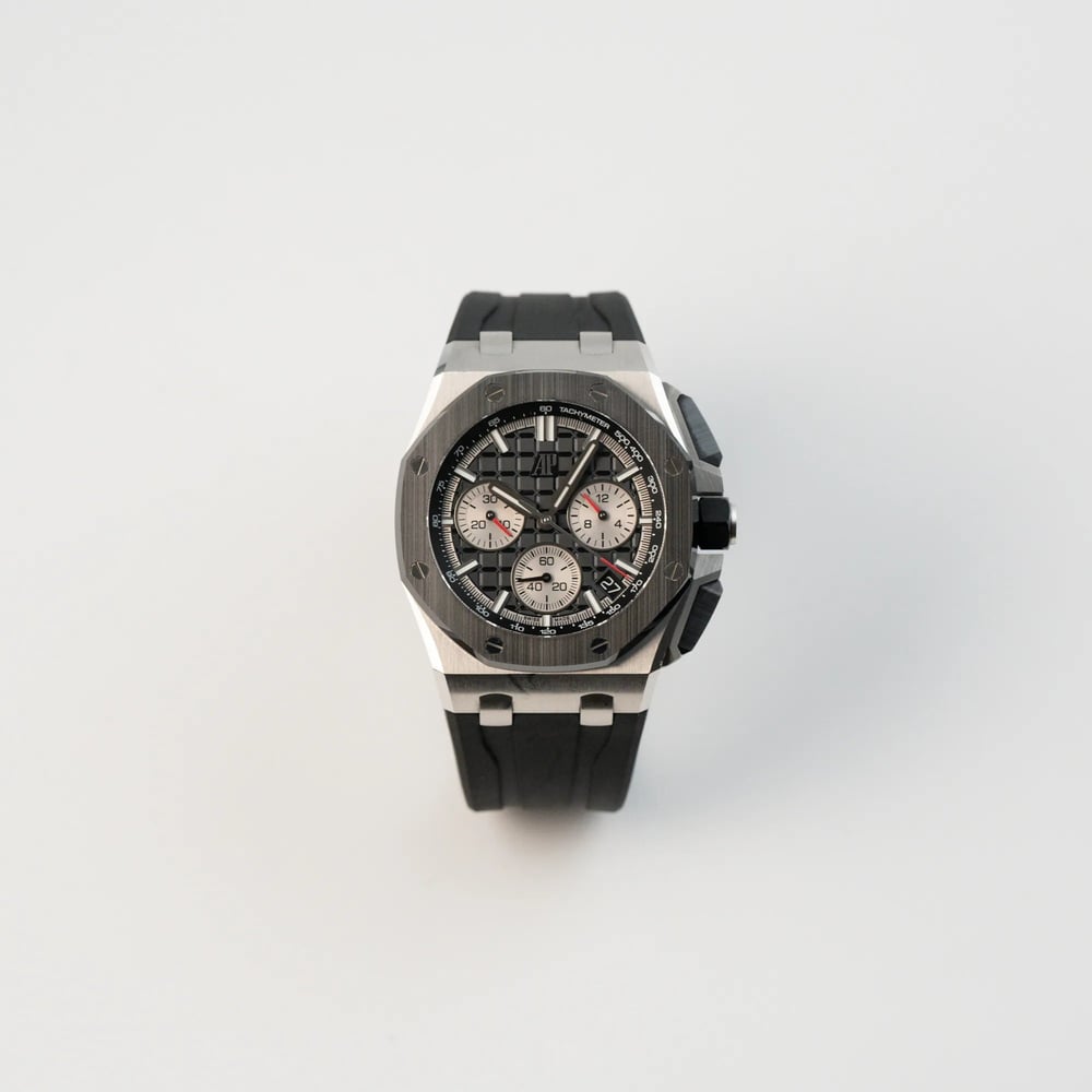 This model is in very good used condition. Only a superficial sign of wear can be seen on the lower case lug. This is the 43mm steel version of the Offshore Chronograph with ceramic bezel.