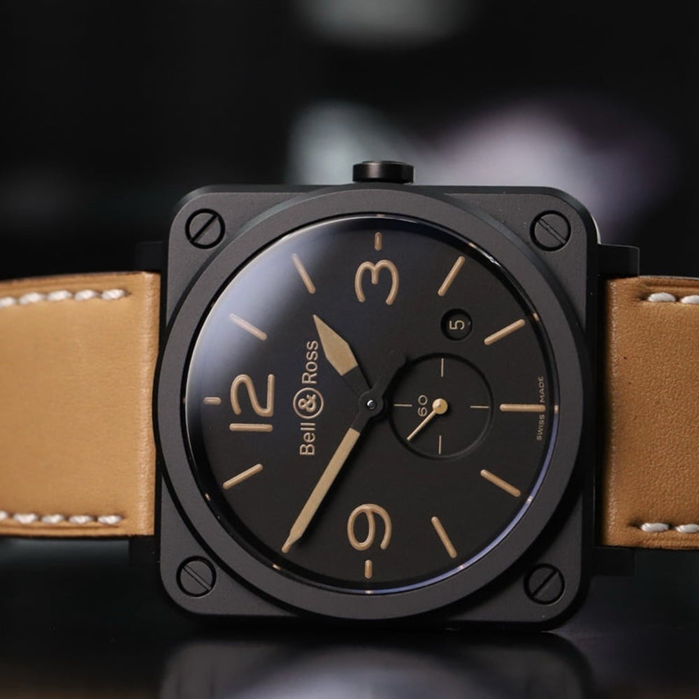 The case is crafted in matte black ceramic, within which lies a matching matte black dial with sand/ecru coloured Super-Luminova markers and indices, topped with pilot-style hands, with a discreet matching date at 4:30, and sub-seconds at 6. Powering it is the quartz BR-CAL.102, and it's mounted to a handmade Bell & Ross calf leather strap with PVD tang buckle.